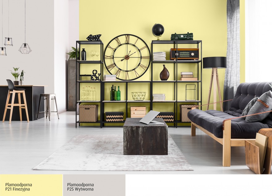 Ciemniejszy odcień żółtego dobrze będzie komponował się także z szarościami. W tym przypadku dobrze zagra we wnętrzu o takich kolorach styl industrialny. We współczesnych loftach i soft loftach, często można spotkać kolor żółty, szary i czarny. Łącząc je uzyskasz nowoczesne, modne wnętrze.