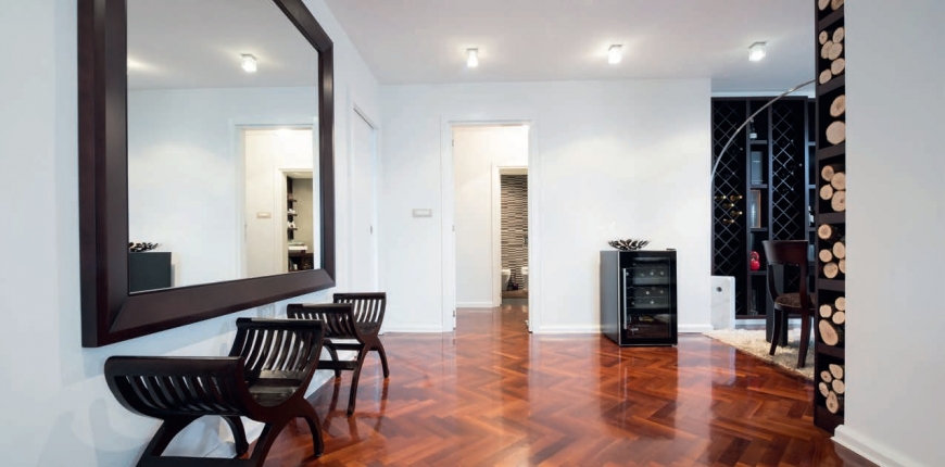 Do ostatniego szlifowania używamy papieru ściernego o granulacji 100- -120. Pamiętajmy, że kierunek prowadzenia cykliniarki ma wpływ na wygląd posadzki. Przy układach w jodełkę urządzenie przesuwamy skośne do deszczułek (w linii wierzchołków złączy), aby wszystkie elementy miały równomierny odcień. Przy prowadzeniu wzdłuż jednego rzędu klepek i poprzecznie względem drugiego, uzyskamy efekt zmiennych odcieni – jaśniejszego modułu szlifowanego wzdłużnie i ciemniejszego przy kierunku poprzecznym.